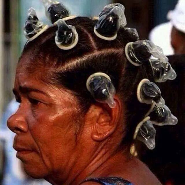 O femeie mulatră a fost surprinsă cu o coafură inedită, doamna care era trecută de prima tinereţe nu a avut cu ce să-şi mai prindă părul decât cu prezervative. La prima vedere ai crede că femeia are în cap bigudiuri, însă nu, aceasta şi-a legat părul în codiţe cu câteva prezervative. Să fie asta o nouă modă?