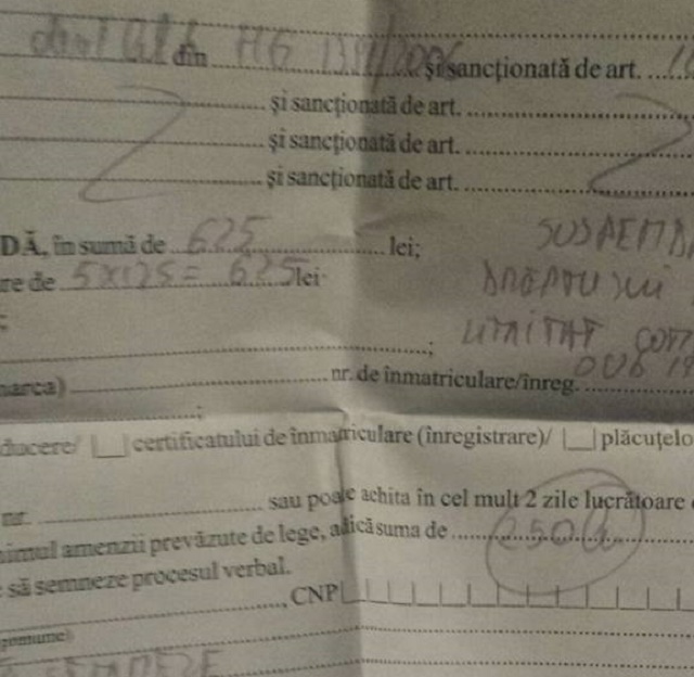 Poliţistul, şef de post într-o comună din judeţul Vâlcea, a devenit celebru printre şoferii din întreaga ţară după ce una dintre "victimele" sale a făcut public un proces-verbal de contravenţie. Conducătorul auto căruia poliţistul i-a suspendat permisul de conducere şi i-a aplicat o sancţiune contravenţională de 625 de lei nu a comentat nicio clipă cu privire la împrejurările în care s-a produs evenimentul din pricina căruia a devenit pieton, însă a dorit să demonstreze cam cât de mult se pricepe organul la aritmetică. Ma exact, a postat documentul în care poliţistul a scris, negru pe alb, că şoferul sancţionat poate achita jumătate din amenda primită (650 de lei) în două zile lucrătoare. 250 de lei, în opinia organului.