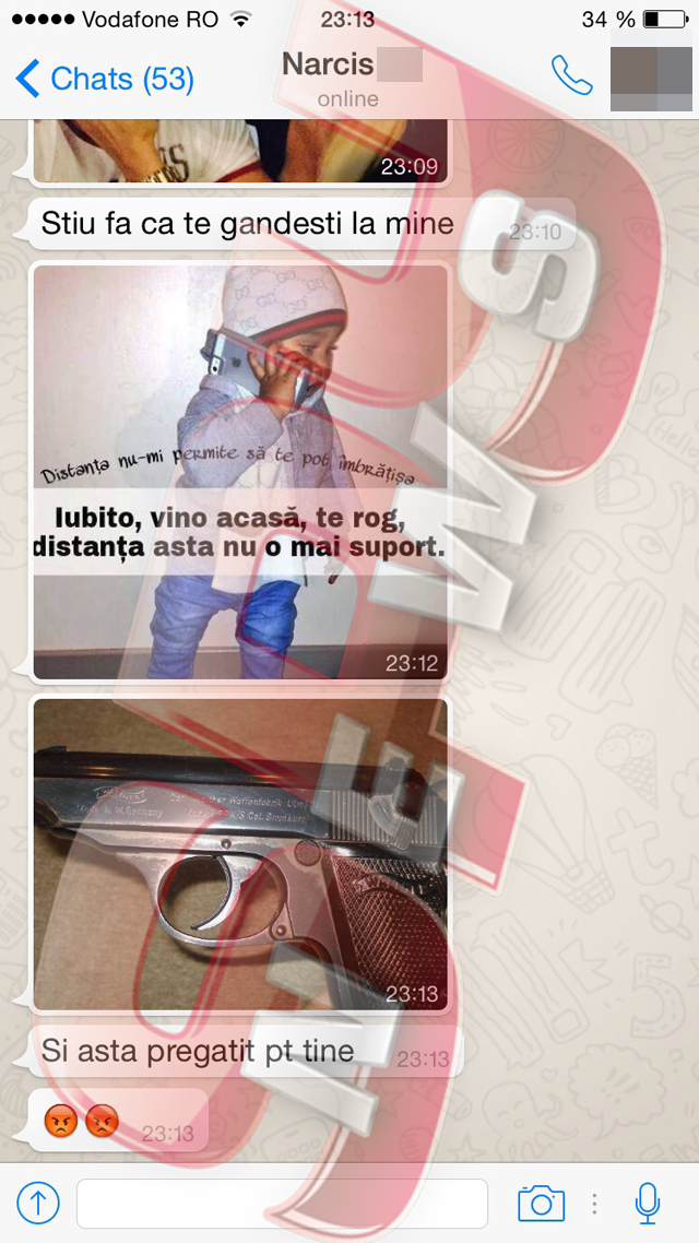 Dacă a văzut că blondina nu se lasă așa uşor convinsă, Narcis a apelat la „artileria grea” şi anume ameninţările, şi nu cu orice, ci cu pistolul şi cu bombe puse în maşină. „Chiar m-am speriat. Mă ameninţă de câteva luni că mă omoară. Mi-a trimis poze cu un pistol şi mi-a spus că e pregătit pentru mine. Apoi mi-a zis că va vorbi cu cineva să îmi pună o bombă în maşină, iar el nu va fi în Bucureşti, să nu se facă vreo legătură”, a declarat, speriată, Simona Traşcă.