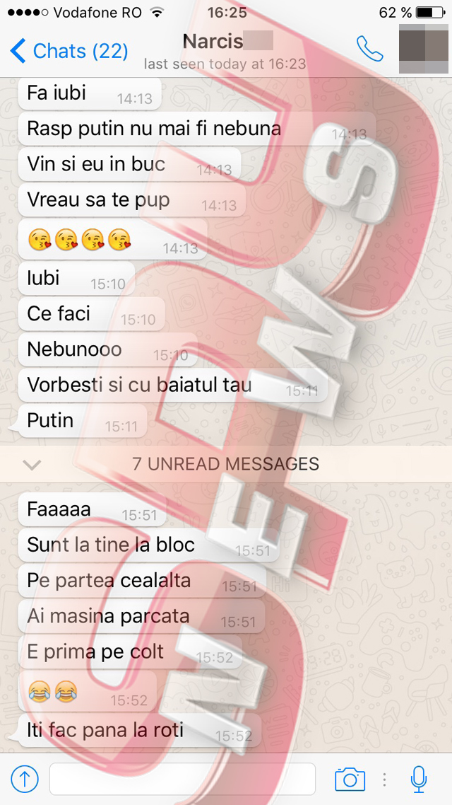 Cum nici ameninţările de la distanţă nu au funcţionat, iar Simona nu s-a lăsat deloc influenţată, fostul iubit a venit direct în Bucureşti, la ea acasă, pentru a o îndupleca. „Astăzi mi-a dat mesaj şi mi-a spus că este în faţa blocului la mine. Mi-a excplicat şi unde am maşina. M-a ameninţat că dacă nu îi răspund, îmi sparge roţile de la maşină. Îmi este frică să nu îmi facă ceva”, a mai spus, extrem de afectată, Simona.
