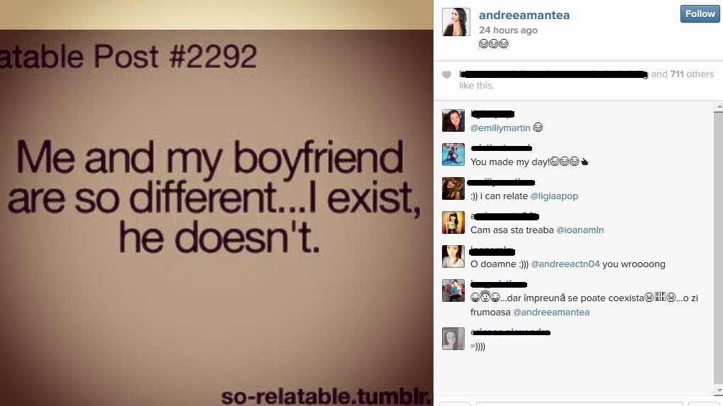 "Eu şi prietenul meu sunt atât de diferiţi. Eu exist, el nu", spune postarea Andreei. Hmm, oare ce a supărat-o pe brunetă atât de tare?