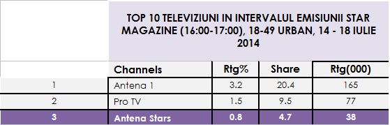Astfel, în săptămâna care s-a încheiat 14- 18 iulie, toate cele cinci ediţii ale celui mai complet şi complex jurnal de ştiri mondene din România, “Star Magazin”, s-au clasat după cele mai importante posturi generaliste din România, Antena 1 şi Protv, şi înaintea altor televiziuni cu tradiţie. Antena Stars, post tv de nişă, a fost urmărit în intervalul orar 16.00-17.00, de o medie de 38.000 de telespectatori din oraşe, cu vârste cuprinse între 18-49 de ani.