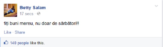 "Fiţi buni mereu, nu doar de Sărbători", îi îndeamnă Bety pe prietenii ei de pe contul de socializare. Unul dintre ei i-a lăsat un comentariu extrem de amuzant: "Bravo, să-i zici asta şi soacrei mele, că ea aşa e obişnuită, să ne împăcăm de Sărbători".