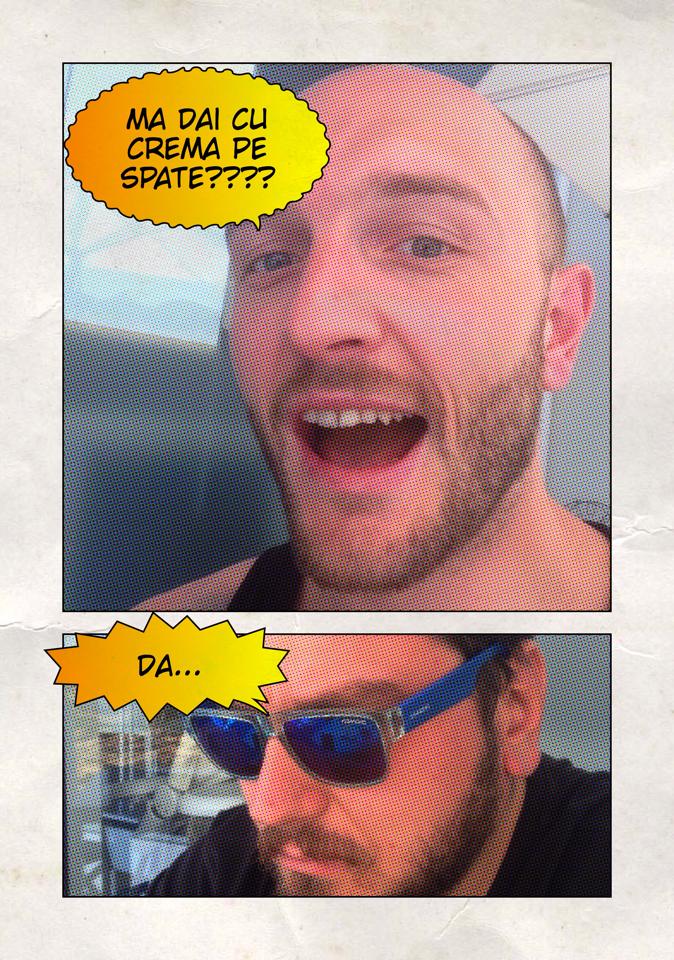 În imagine, "păcătosul" Bordea îl întreabă dacă îl dă cu cremă pe spate, iar răspunsul vine rapid: DA. Ei, bine, oare ce părere are Livia? Nu ar fi preferat să-i ceară ei ajutorul?