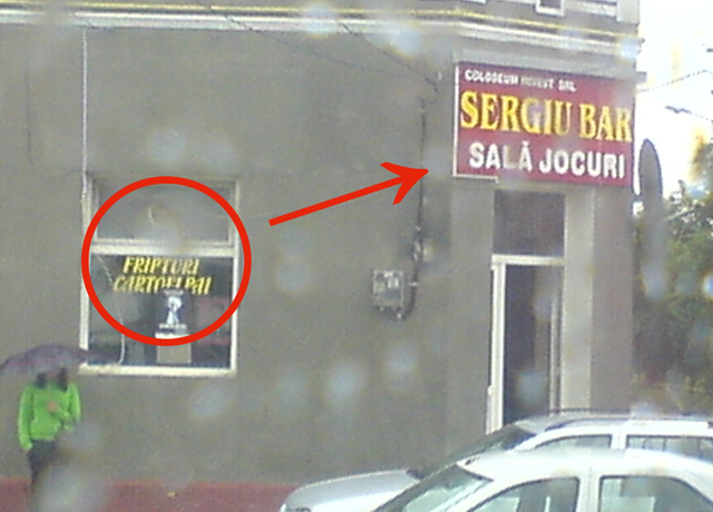 Un alt afacerist de succes, care îmbină utilul cu plăcutul, îi îndeamnă pe trecători să-și potolească foamea cu niște fripturi însoțite de cartofi pai la... sala de jocuri. Nu explică însă dacă păcănelele sunt cu aromă de porc sau pulpele de pui sunt de treflă.