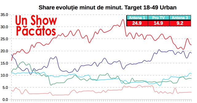 Astfel, emisiunea "Un show păcătos" a avut cea mai mare cota de piata , pe publicul comercial cu un share de 24,9, în timp ce Pro TV a obţinut un share de 14, 9, iar Kanal D a înregistrat un share de 8.9. Asta inseamnă că emisiunea prezentată de Dan Capatos a fost cea mai urmarită emisiune din România.