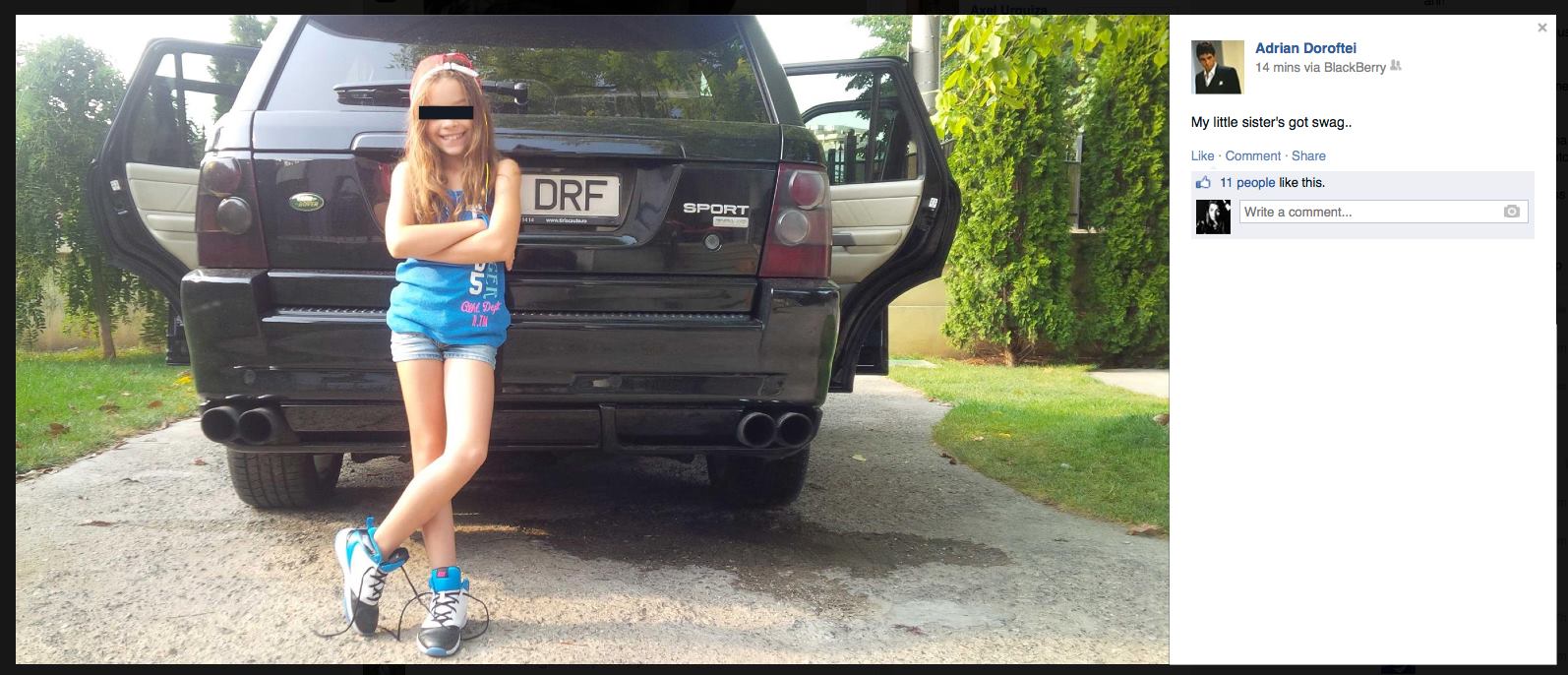 Mezina familiei Doroftei pare a avea o personalitate puternică, deşi abia a trecut de 10 ani. Îmbrăcată sport, într-un tricou, pantaloni scurţi, pantofi descheiaţi la şireturi şi o şapcă pusă invers pe cap, Vanessa se sprijină de maşina tatălui. Fotografia a fost făcută publică de către fratele său mai mare care a scris nostalgic: "Surioara mea cea mică şi-a găsit stilul". Monica și Leonard sunt căsătoriţi de 21 de ani și au împreună trei copii, Vanessa de 10 ani, Alex de15 ani și Adi de 18 ani.