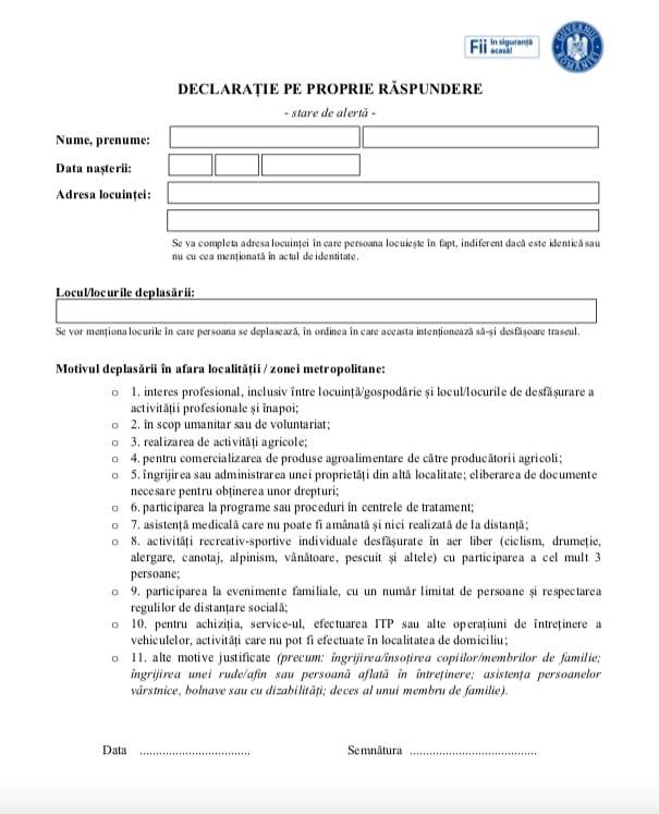 FOTO. Cum arată noua declarație pe proprie răspundere pentru ieșirea din localitate. Motivele permise