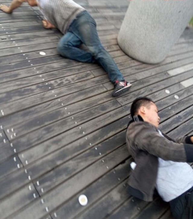 Mai multe fotografii surprinse în oraşul Zhengzhou îi înfăţişează pe angajaţi cum se târăsc în genunchi pe marginea unui lac. Pedeapsa a fost stabilită de managerii companiei unde aceştia lucrează pentru că nu şi-ar fi îndeplinit targetul în vânzări.