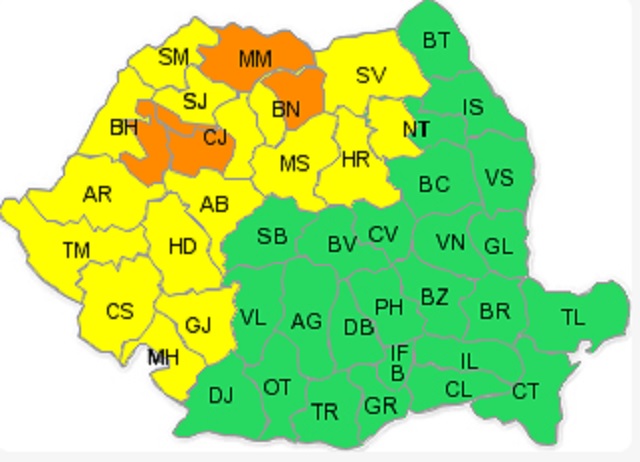 Pe parcursul zilei de sâmbătă (21 noiembrie) şi în noaptea de sâmbătă spre duminică (21/22 noiembrie) în judeţul Maramureş, precum şi în zonele de munte ale judeţelor Bistriţa Năsăud, Bihor, Cluj şi Sălaj se vor acumula cantităţi de apă care vor depăşi local 50 l/mp şi izolat 70 l/mp.