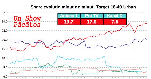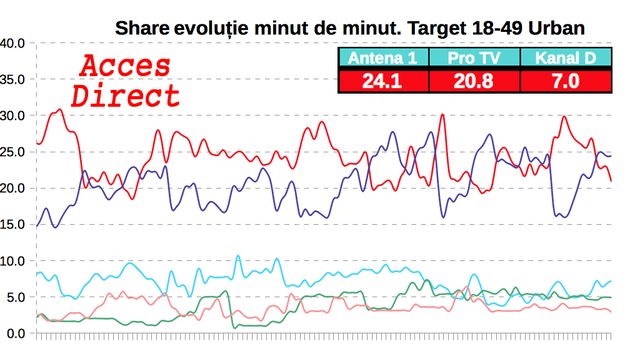 Emisiunile "Acces direct" şi "Un show păcătos" au primit din nou coroniţa, după ce au surclasat concurenţa. Joi, Simona Gherghe şi Dan Capatos au fost pe primul loc în preferinţele telespectatorilor, înregistrând un share 24,1 si un rating de 5, respectiv un share de 19, 7 şi un rating 4,2, cifre la care principalii competitori privesc cu jind. Vă mulţumim pentru că urmăriţi în număr atât de mare emisiunile "Acces direct" şi "Un show păcătos" şi vă invitam să staţi cu ochii pe Antena 1, pentru întâlnirile cu Simona Gherghe şi Dan Capatos!