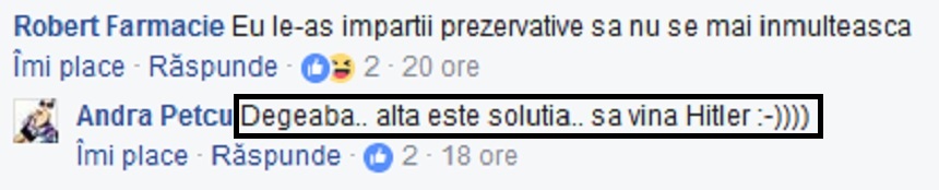 Imediat, prietenii tinerei au început să comenteze această postare. „Eu le-aş împărţi prezervative, să nu se mai înmulţească”, a scris un bărbat. Iubita lui Mihai Chiţi a răspuns: „Degeaba! Alta este soluţia! Să vină Hitler”.