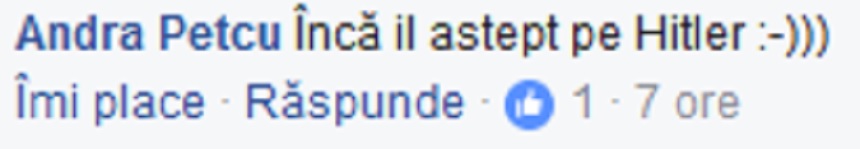 După ce alte persoane şi-au dat şi ele cu părerea faţă de gestul făcut de individul din imagini, Andra Petcu a continuat: „Încă îl aştept pe Hitler”.