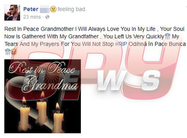 În urmă cu doar câteva minute, Peter Kai a postat pe contul său de socializare un mesaj extrem de emoţionant, prin care anunţa faptul că bunica lui a încetat din viaţă. „Rest in peace grandmother. I will always love you in my life. Your soul now is gathered with my grandfather. You left us very quickly. My tears and my prayers for you will not stop. Odihneşte-te în pace bunica” ( Odihnește-te în pace, bunică. Te voi iubi toată viața mea. Sufletul tău este acum cu bunicul meu. Ne-ai părăsit foarte repede. Lacrimile și rugăciunile mele pentru tine nu se vor opri niciodată. Odihneşte-te în pace, bunică), a scris Peter Kai.