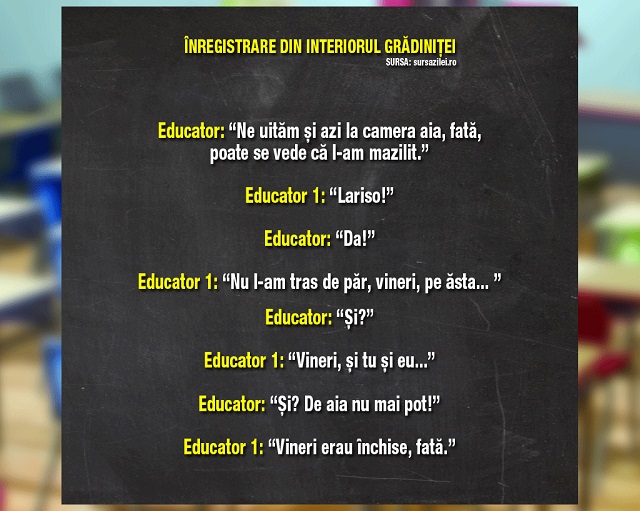 Părinţii care plătesc în jur de 1.000 de lei lunar şi-au dat seama că se petrece ceva rău când au văzut că cei mici nu mai râdeau, aveau tulburări de somn sau ajungeau acasă plini de vânătăi. Părinţii copiilor au ascuns microfoane în jucării şi au surprins şi discuţiile halucinante dintre educatoare.