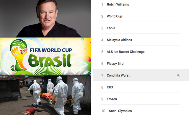 Astfel, într-un top publicat, recent, de Google, cel mai căutat subiect a fost dispariția celebrului actor de comedie Robin Williams. Urmează apoi un domeniu sportiv, Cupa Mondială de Fotbal și, pe locul al treilea, virusul Ebola.