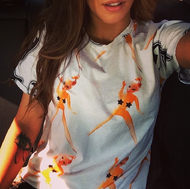 Vedeta apare îmbrăcată cu un tricou cu imprimeu în formă de păpuşă dezbrăcată, cu sânii "cenzuraţi" de două stele negre. Fanii i-au dat imediat mii de like-uri şi i-au lăsat o mulţime de comentarii în care-i spuneau că-i apreciază haina şi o întrebau de unde şi-a cumpărat-o.
