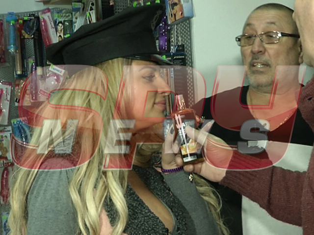 În timp ce studia oferta generoasă din magazin, blonda părea foarte dibace în recunoaşterea lenjeriei intime comestibile. I-au atras atenţia şi parfumul cu feromoni, biciuștile sau celebrele cătușe cu puf.