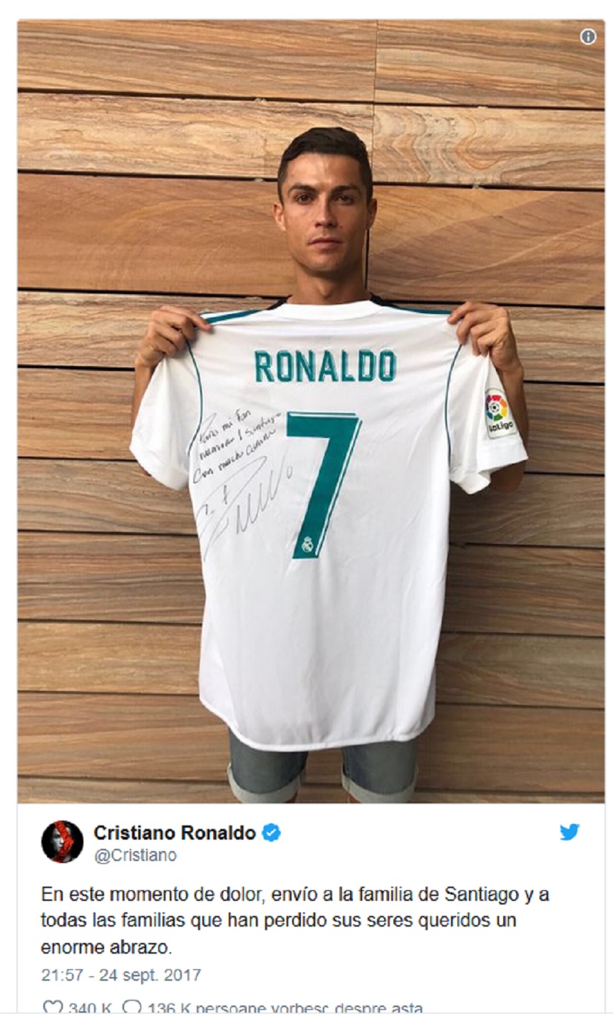 “În aceste momente de panică, trimit o îmbrăţişare uriaşă familiei lui Santiago, dar şi tuturor celorlalte familii care şi-au pierdut persoanele iubite”, a fost mesajul lui Cristiano Ronaldo.