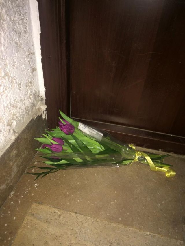 În faţa uşii, pe jos, lângă pragul de la intrare, ea a găsit un frumos buchet de lale de culoare mov. Gestul a impresionat-o foarte mult, după cum le-a mărturisit prietenilor săi virtuali.