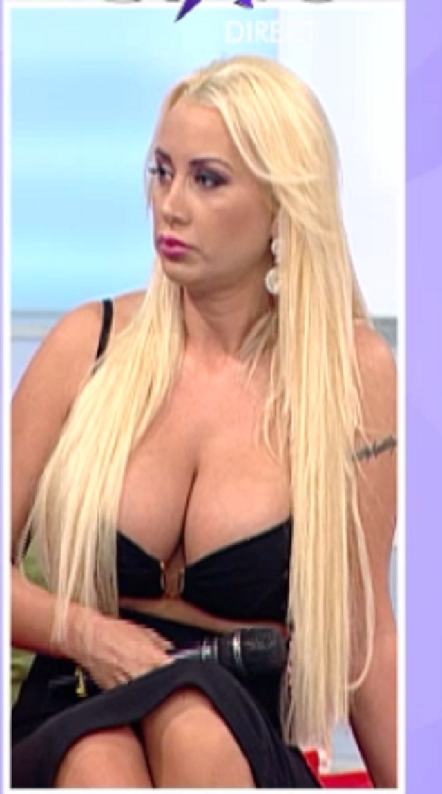 Invitată în platoul emisiunii "Star Matinal", Simona Traşcă şi-a etalat formele perfecte într-o rochie neagră, cu decolteu adânc. Sânii imenşi ai blondei abia au încăput în cupele bustierei de culoare neagră.