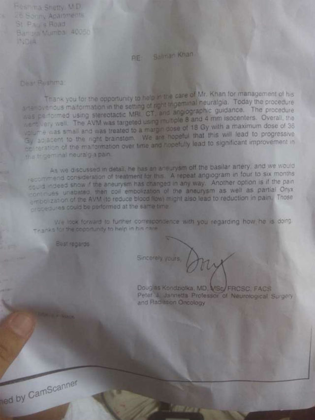 Conform aceleaşi surse, Salman Khan este afectat de decizia magistraţilor, astfel că apelează la diverse mijloace de a scăpa de închisoare. El a prezentat un certificat medical conform căruia starea lui de sănătate este una precară, iar săvârşirea pedepsei l-ar putea afecta destul de rău.Conform certificatului medical, Salman Khan are probleme cu inima.