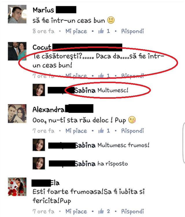 „Încă puţin”, a fost mesajul care a însoţit fotografia postată de Sabina, iar felicitările celor apropiaţi nu au întârziat să apară, semn că Sabina a reuşit să atragă simpatia multora, chiar dacă nu a stat foarte mult timp în competiţie. „Casă de piatră! Să fii fericită”, „Felicitări! Doamne ajută” sau „Te căsătoreşti? Dacă da, să fie într-un ceas bun”, au fost câteva dintre mesajele pe care Sabina le-a primit, iar ea le-a răspuns, bineînţeles: „Mulţumesc”.