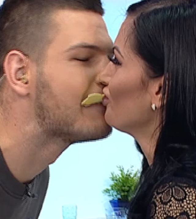 Prezentatorul TV n-a stat prea mult pe gânduri până ce a mers la dulap să caute spaghete şi să imite filmuleţul. Asta nu se găsea în dulap, dar nu s-a dat bătut. A găsit o felie de lasagna şi a ales s-o împartă cu asistenta lui, Raluca Dumitru, până când ce aproape s-au sărutat.