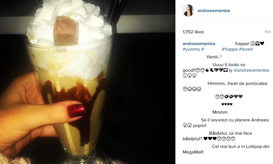 "Frappe. Iubesc asta", sunt hashtagurile care însoţesc imaginea postată de Andreea Mantea pe o reţea de socializare.