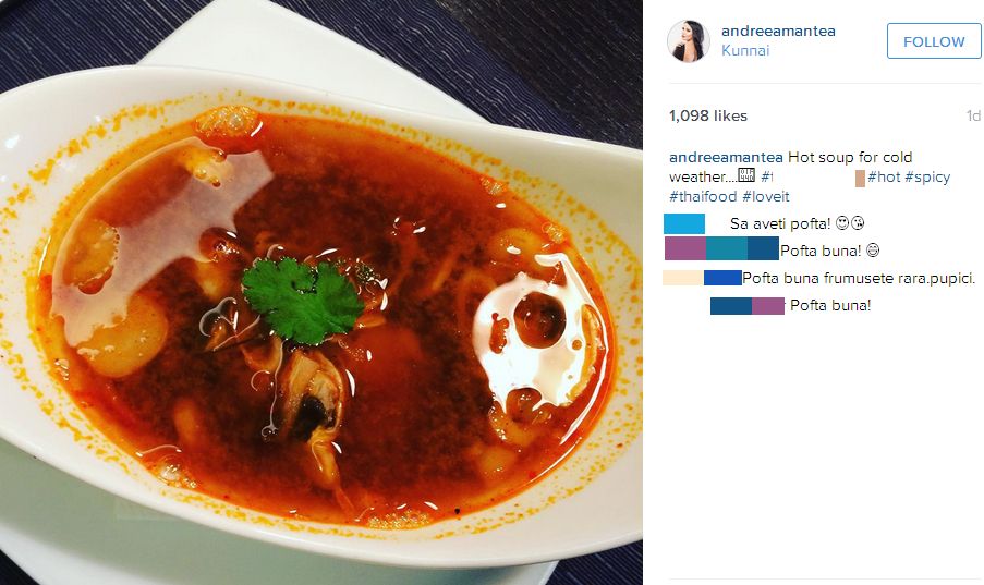 "Supă fierbinte pentru vremuri reci. Fierbinte. Iute. Iubesc mâncarea thailandeză", este mesajul care însoţeşte imaginea cu supa, care arată absolut delicios.