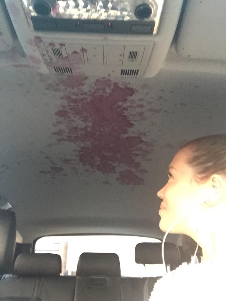 Automobilul ei personal a ajuns să arate ca o scenă de crimă, după ce vedeta a desfăcut, cel mai probabil, o sticlă de vin sau o doză dintr-o băutură carbogazoasă.