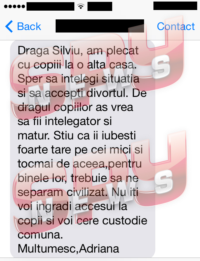 ”Dragă Silviu, am plecat cu copiii la o altă casă. Sper să înțelegi situația și să accepți divorțul. De dragul copiilor aș vrea să fii înțelegător și matur. Știu că îi iubești foarte tare pe cei mici și tocmai de aceea, pentru binele lor, trebuie să ne separă,m civilizat. Nu îți voi îngrădi accesul la copii și voi cere custodie comună. Mulțumesc, Adriana”, este mesajul pe care Silviu prigoană l-a primit pe telefon în urmă cu câteva minute.