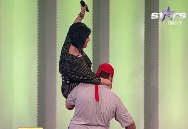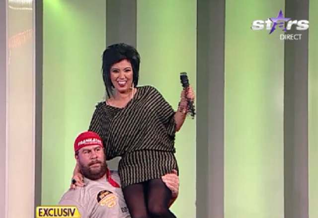 Moderatoarea TV l-a provocat pe culturist să o ridice în braţe, iar bărbatul a surprins-o cu o mişcare bruscă. Speriată că rochia i s-ar putea ridica, Bahmu a început să se agite puţin, însă pauza de publicitatea a salvat-o din întreaga situaţie.