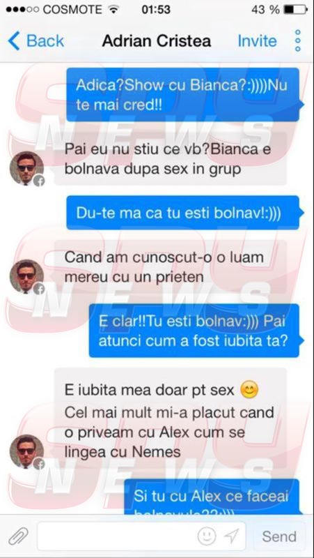 Apariţia unor presupuse conversaţii între Adi Cristea şi Renata, iubita lui Leo de la Strehaia, în care fotbalistul îi âmpărtăşea brunetei detalii despre o partidă de sex în grup cu Bianca, Roxana Nemeş şi un prieten al lui, a încins spiritele!
