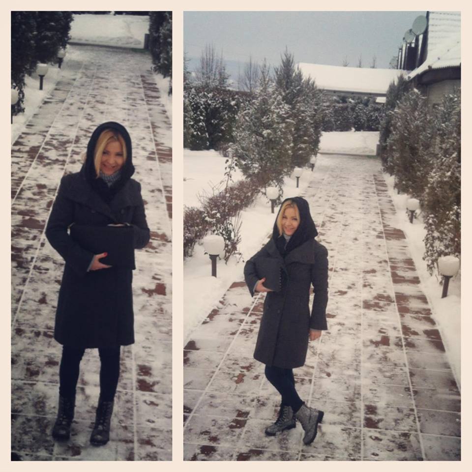 Frigul şi ninsoarea au determinat-o pe Alessia să se îmbrace foarte gros. Blonda a ales un palton gri, elegant, o pereche de pantaloni negri şi stâmţi. Singura "pată strălucitoare" a cântăreţei sunt botinele ei cu sclipici. Mai mult, din cauza căciulii, şuviţele roz nu se mai văd deloc, iar întreaga ţinută o face să pară mult mai matură.