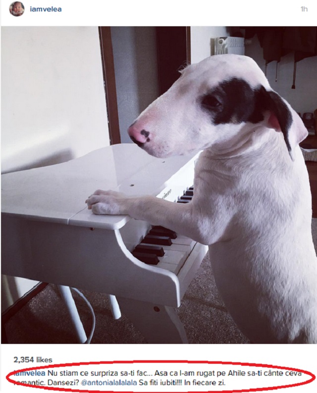 Velea a postat pe o reţea de socializare o fotografie cu unul dintre căţeii familiei, care se joacă cu pianul lui Dominic.