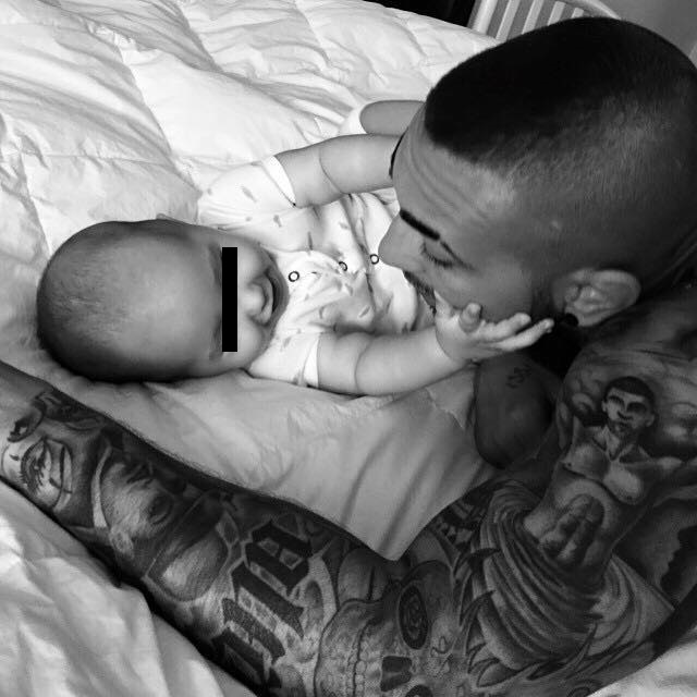 În imagine, artistul se joacă împreună cu băieţelul, care este tot numai un zâmbet atunci când îşi vedete tatăl.