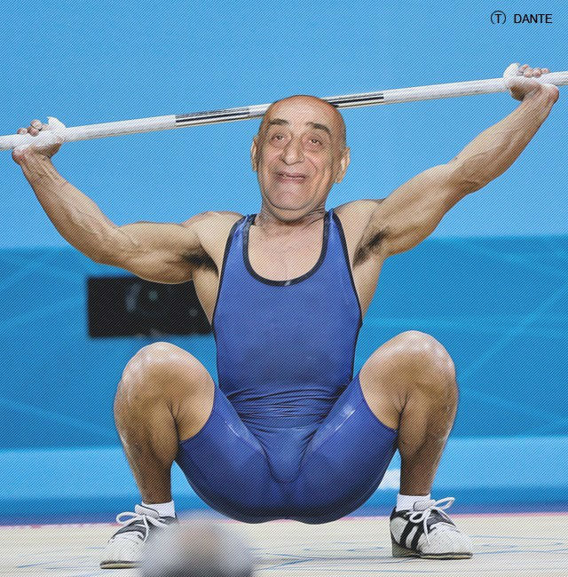 Plin de muşchi şi îmbrăcat într-un costum mulat, fost edil al Capitalei zâmbeşte victorios în momentul în care ridică halterele deasupra capului exact ca un campion.