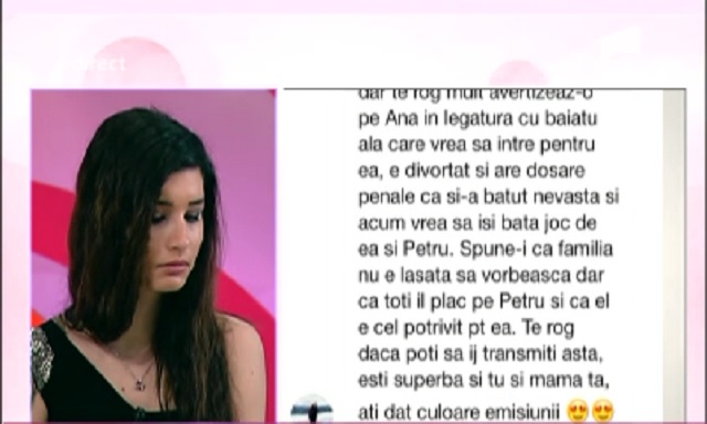 "Te rog să o avertizezi pe Ana în legătură cu băiatul ăla care vrea să intre pentru ea. E divorţat şi are dosare penale pe motiv că şi-a bătut nevasta, iar acum vrea să-şi bată joc de ea şi de Petru. Spune-i că familia nu e lăsată să vorbească, dar că toţi îl plac pe Petru şi că el este cel potrivit pentru ea", a fost mesajul pe care l-a primit Ana, prin intermediul Margheritei.