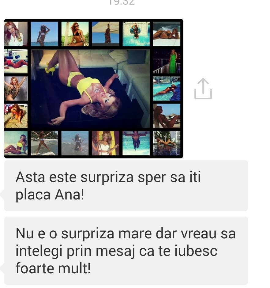 "Asta este surpriza! Sper să îţi placă, Ana! Nu e o surpriză mare, dar vreaz să înţelegi prin mesaj că te iubesc foarte mult", i-a scris realizatorul colajului Anei.