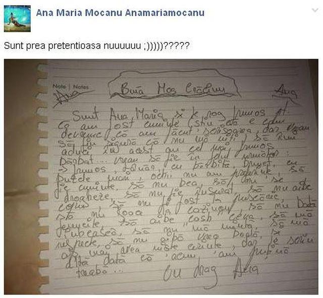 "Vreau să fie în felul următor: frumos, tânăr, cu bărbiţă, brunet, cu buze mari, să nu bea, să nu se drogheze, să nu fie însurat, să nu aibă copii, să nu fi fost la puşcărie, să nu joace la casino, să nu bată femeile, să aibă "cash" ceva, să mă iubească, să nu mă mintă, să mă respecte, să nu aibă vreo boală şi aş mai avea nişte cerinţe, dar le scriu altă dată că acum am puţină treabă. Cu drag Ana", a scris Ana Mocanu pe Facebook.