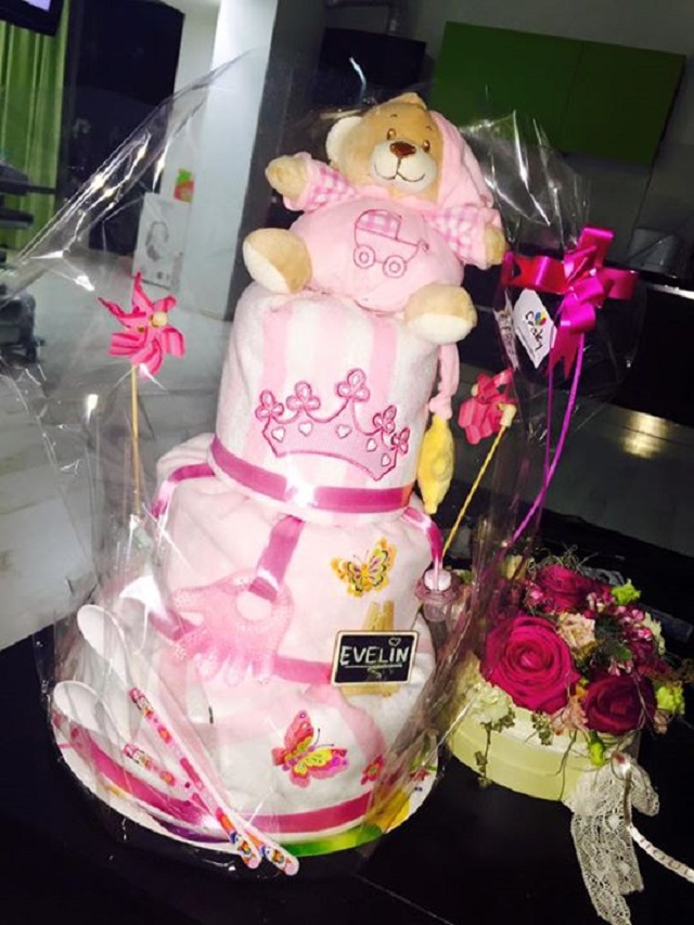 "Woowww!!! Primul tortuleţ al fetiţei mele şi cel mai frumos! Un tort deosebit din pamperşi, jucării, suzete şi păturici!", a scris Anda Adam la descrierea imaginii de pe Facebook.