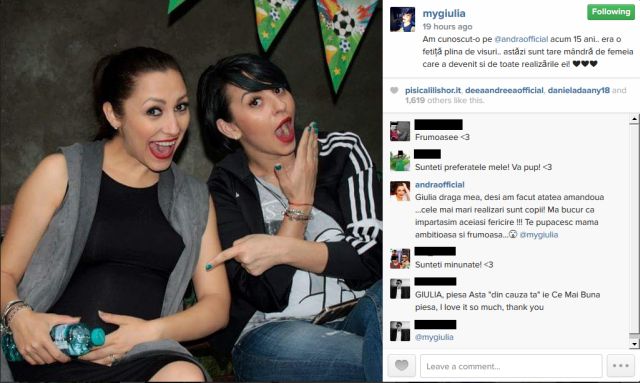 "Am cunoscut-o pe Andra acum 15 ani, era o fetiță plină de visuri. Astăzi sunt tare mândră de femeia care a devenit şi de toate realizările ei! ", a scris Giulia pe Facebook.