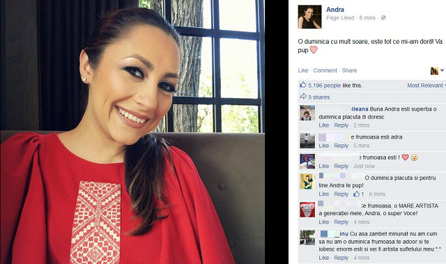 Andra este o cântăreaţă îndrăgită de fani şi îi ţine la curent cu tot ceea ce face, numai că azi a cam comis-o pe internet. Zâmbitoare, artista le-a urat prietenilor din mediul virtual să aibă o duminică însorită. Surpriză, însă! Artista a pus virgula fix unde nu trebuia, adică între subiect şi predicat.