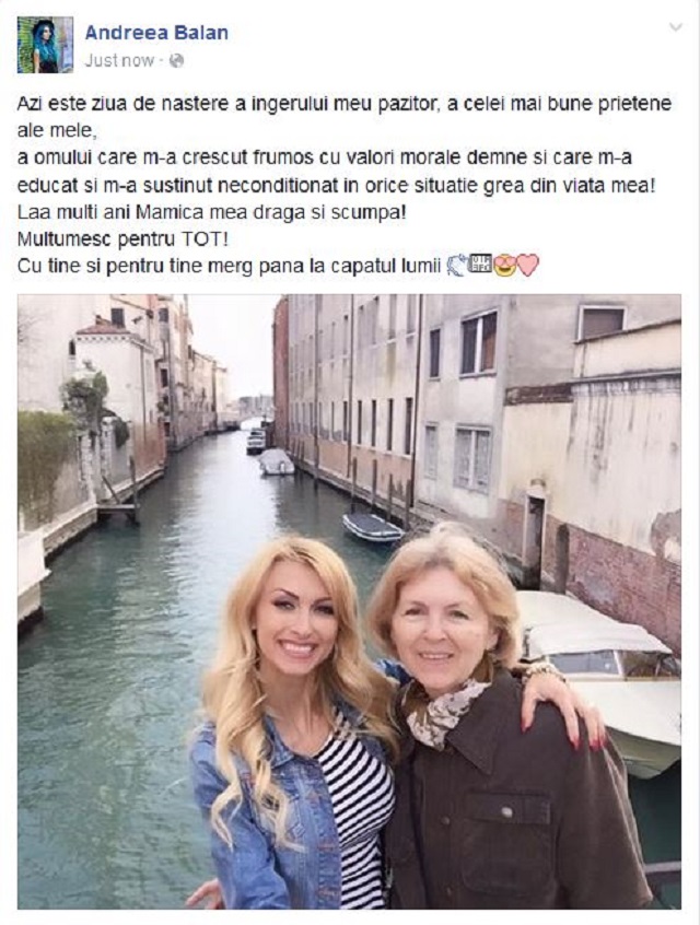 Andreea a postat pe un site de socializare o fotografie cu ea şi mama ei, iar mesajul care însoţea imaginea a reuşit să îi emoţioneze pe fanii artistei până la lacrimi. "Azi este ziua de naştere a îngerului meu păzitor, a celei mai bune prietene ale mele, a omului care m-a crescut frumos cu valori morale demne şi care m-a educat şi m-a susţinut necondiţionat în orice situaţie grea din viata mea! La mulţi ani Mămica mea dragă şi scumpă! Mulţumesc pentru TOT! Cu tine şi pentru tine merg până la capătul lumii", a scris Andreea Bălan pe pagina ei de socializare.