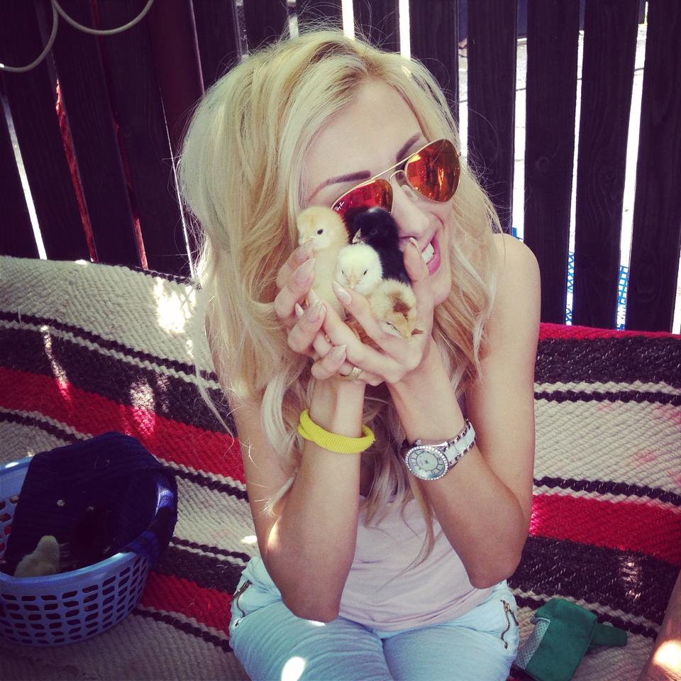 Andreea a profitat de acest moment şi s-a fotografiat alături de bunica sa, dar şi cu mai mulţi puişori de găină.