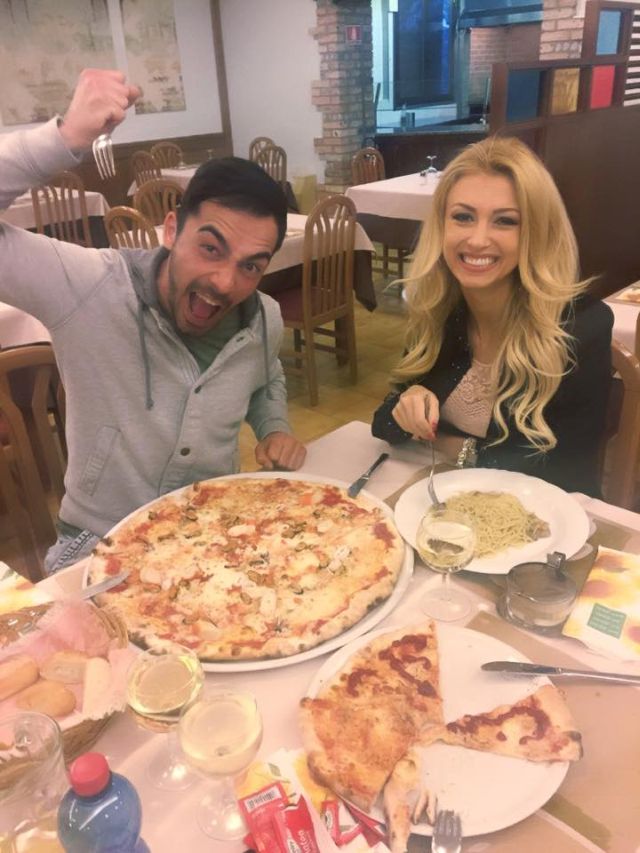 Ajunsă la Veneţia, Andrea Bălan a fost să mănânce specialităţi italieneşti, pizza şi paste, împreună cu Petrişor, dansatorul ei.