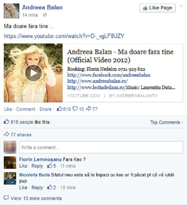 Chiar dacă spunea că ea şi Keo nu mai erau, de la o vreme, pe aceeaşi lungime de undă, Andreea Bălan pare că suferă după cel care i-a fost iubit timp de nouă ani. "Mă doare fără tine....", a scris blonda, publicând şi o melodie de-ale ei, cu acelaşi nume. Fanii i-au spus să încerce să redevină un cuplu alături de Keo."Sfatul meu este să te împaci cu Keo... ar fi păcat, pentru că vă iubiţi", i-a comentat un admirator.