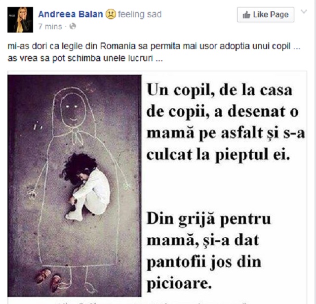 Andreea Bălan a spus, după despărţirea de Keo, că şi-ar fi dorit mult un copil. Acum, blonda i-a uimit pe prietenii ei de pe contul de socializare. A publicat o poză emoţionantă cu o fetiţă orfană care a desenat silueta unei "mame" pe asfalt şi s-a ghemuit la "pieptul" ei. Andreea Bălan a scris şi un mesaj surprinzător. "Mi-aş dori ca legile din România să permită mai uşor adopţia unui copil. Aş vrea să pot schimba unele lucruri", a spus cântăreaţa, pe Facebook. Unii dintre admiratori se gândesc că vedeta plănuieşte să adopte un copil.