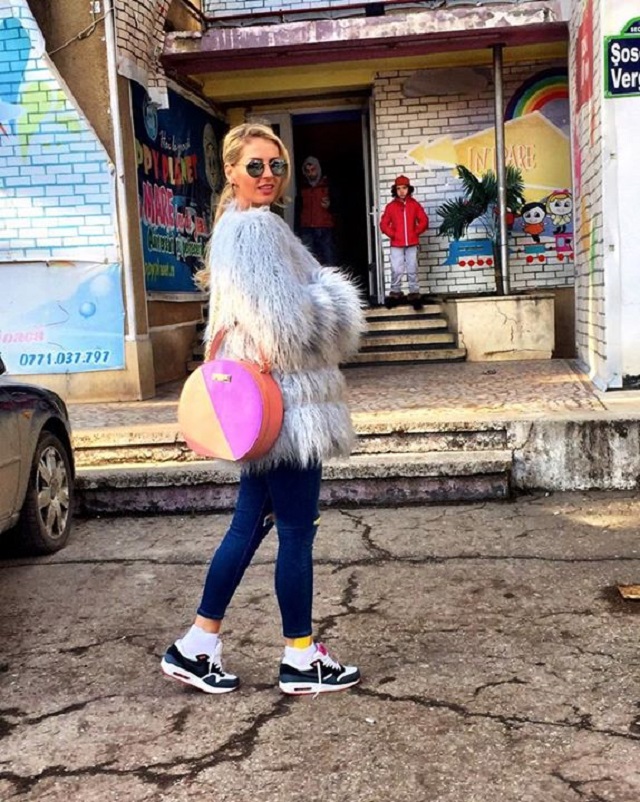 Andreea Bănică a optat pentru o ţinută formată dintr-o pereche de colanţi, adidaşi, o haină de blană şi o geantă foarte colorată. Fanii au postat comentarii, precum: "Imbrăcată foarte naşpa ca de obicei" sau "Nu-mi place!".